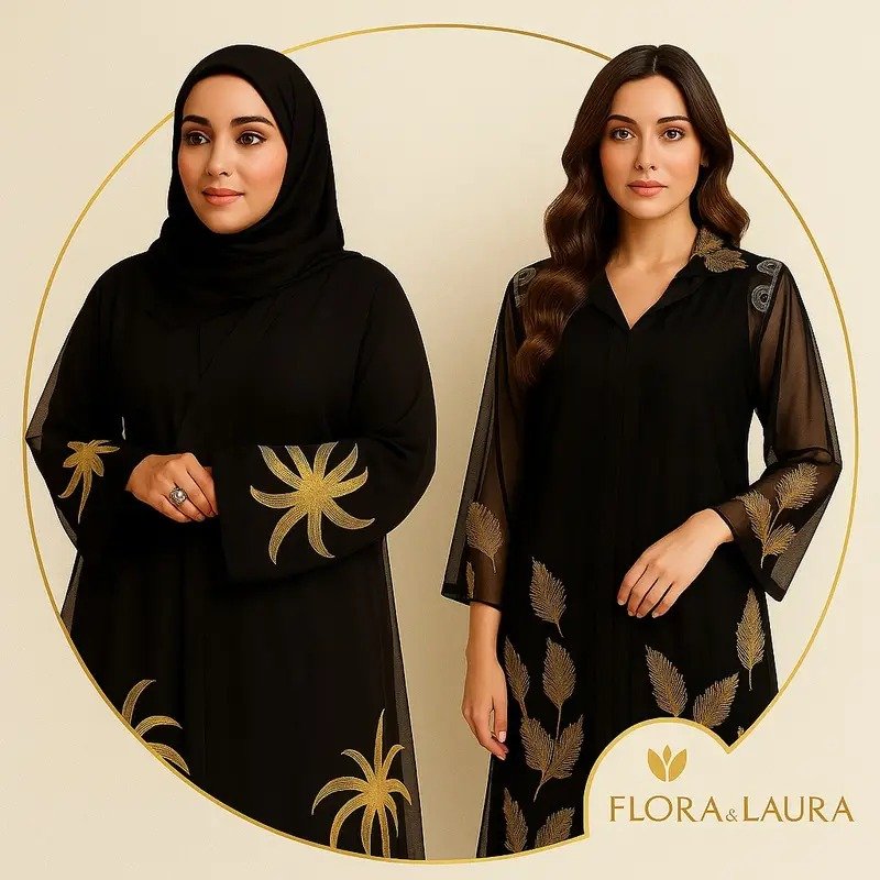 قطع مثل Golden Palm Abaya من متجر Flora & Laura تمثل هذا المفهوم بوضوح: