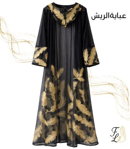 عباية الشيفون الفاخرة بتطريز الريش الذهبي