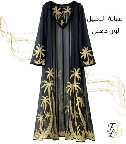 عباية شيفون فاخرة بتفاصيل نخيل ذهبية مطرزة